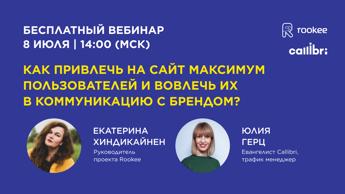 Приглашаем на вебинар «Как привлечь на сайт максимум пользователей и вовлечь их в коммуникацию с брендом?» Эксперты Callibri и Rookee ответят на этот вопрос и расскажут, как привести трафик из поиска Яндекса и превратить пользователей в клиентов, используя онлайн – чаты, на бесплатном вебинаре 8 июля в 14:00 (мск). В первой части встречи Екатерина Хиндикайнен, руководитель проекта Rookee, расскажет о «SEO-продвижении бизнеса в Яндексе»: Во второй части Юлия Герц, евангелист Callibri, расскажет «Как бизнесу организовать коммуникацию с клиентами в WhatsApp, Telegram, Instagram и не терять входящие обращения»: Регистрация по ссылке.