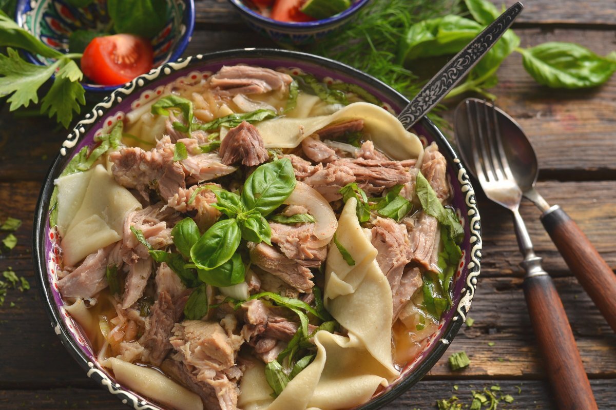 В некоторых районах Башкортостана его делают большим, а в южных более мелкими. Тесто готовится одинаково. Для семьи достаточно использовать одно или две яйца, одну или две ложки кипящего бульона. Если добавить кипящий бульон или воду в тесто, то бишбармак не разваривается. Тесто нужно раскатать очень тонко. Подождать, чтобы тесто высохло и резать квадратики или прямоугольники. Есть два способа приготовления бишбармака. В кастрюлю кладем мясо и наливаем холодную воду. В зависимости от мяса варится в пределах 1,5 или 2 часа. Когда мясо готово убираем и в бульоне варим картошку. Бишбармак размером 3/4 см также варим в бульоне. В красивую тарелку сначала кладем нарезанное мясо, затем картошку сверху бишбармак. Сверху наливаем немного бульона и украшаем зеленью. Бульон подаем отдельно и конечно кстати будет корот. Пост о том как сделать башкирский корот; Башкирский корот. | Зухра Хасанова | Яндекс Дзен (yandex.ru) Второй способ, когда бишбармак режется маленькими квадратиками и кладем