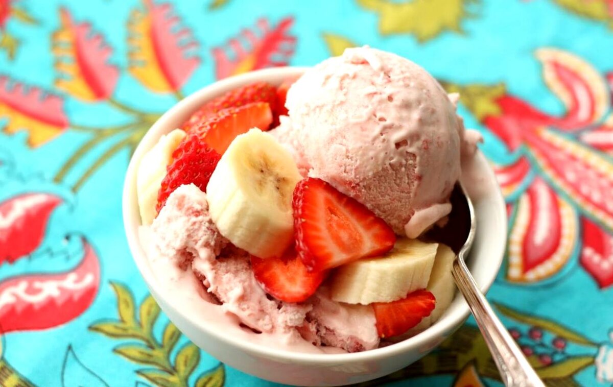 Ингредиенты: Спелые бананы-3 штуки Замороженная клубника-80 г Коровье или растительное молоко-120 мл Сахар, мёд или другой подсластитель-по вкусу Приготовление 1․Нарежьте очищенные бананы кружочками или кусочками. 2․Уберите в контейнер или пакет для заморозки. 3․Поместите в морозилку на ночь или минимум на 2 часа. 4․Выложите в чашу блендера бананы и клубнику. Влейте молоко. При желании добавьте ванильный экстракт. 5․Взбейте так, чтобы получилась однородная кремообразная масса. 6․Попробуйте её и, если нужно, добавьте сахар, мёд или другой подсластитель. 7․Переложите массу в широкий контейнер. Накройте крышкой или плёнкой. 8․Уберите в морозилку на 1–2 часа.