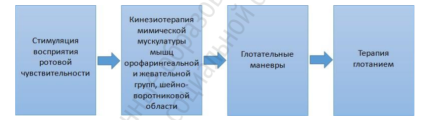 На рисунке изображён алгоритм применение стимулирующих и тренировочных методов физической реабилитации больных с нейрогенной дисфагией (с учётом возможного регресса неврологической симптоматики и динамического повышения нагрузки).