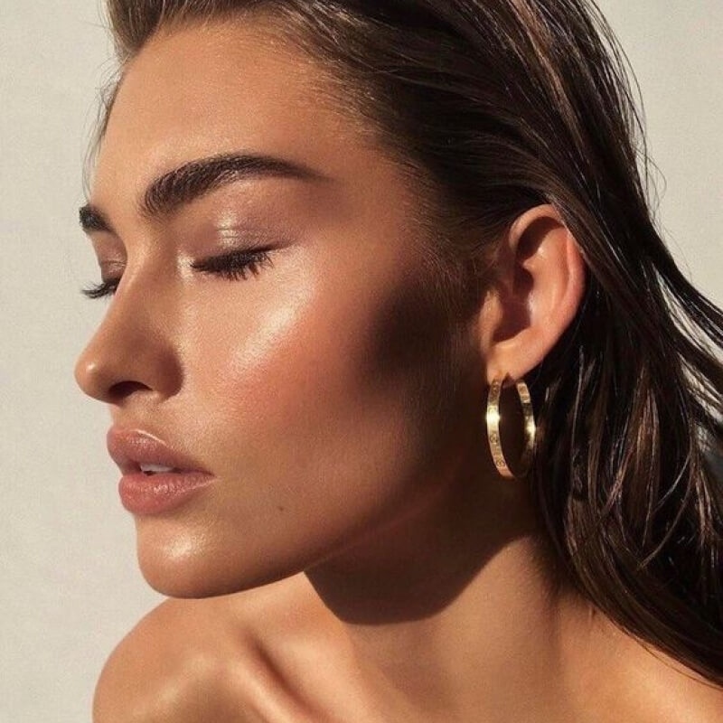 Хайлайтер пригодится и здесь. Надев наряд с открытыми плечами, нанеси продукт широкой кистью тонким слоем (можно добавить на ключицы и в зоне декольте). Оптимальное решение для загорелой кожи, но актуально и в начале лета!