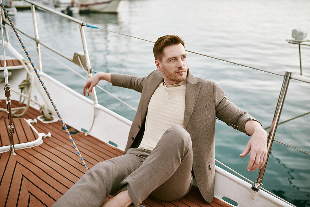 Для жаркого летнего дня идеально подходят легкие, воздушные, натуральные ткани, благодаря которым элегантный наряд становится не только подходящим случаю, но и комфортным. Благодаря натуральным тканям кожа дышит, поэтому в них не будет жарко. Идеальными вариантами являются хлопок, шелк и, конечно же, лен. Вещи изо льна не только обеспечивают идеальную посадку и максимальный комфорт, но вы глядят достаточно презентабельно. Как, например, льняные костюмы от KANZLER - безупречность и роскошь шик в одном образе. На фото: пиджак изо льна, брюки изо льна, поло из хлопка Пима. В чем же особенность льняной ткани по сравнению с стальными? ⦁ Лён имеет матовую фактуру и поэтому вещи из него смотрятся стильно и элегантно. ⦁ Кроме презентабельного вида, льняная одежда славится своими уникальными свойствами. Лён поглощает высокую температуру, отражает солнечные лучи и, всегда оставаясь прохладным на ощупь, поддерживает комфортную воздушную прослойку между одеждой и кожей. Именно поэтому в летнем