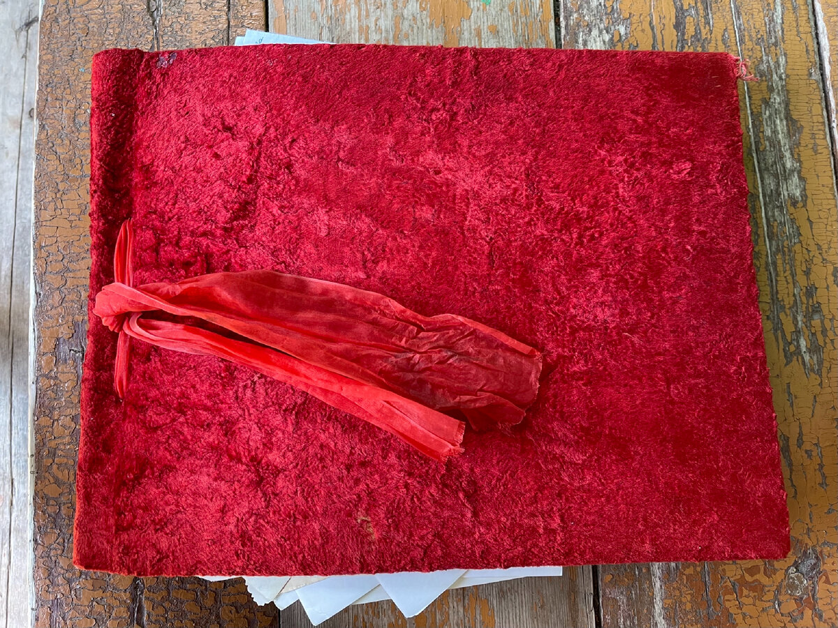 Это полностью рукотворный альбом, который оклеен плюшем цвета красного знамени даже с элементами чеканки.