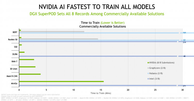 Открытый инженерный консорциум MLCommons опубликовал новые результаты MLPerf Training v1.0, набора тестов для оценки производительности машинного обучения. MLPerf Training измеряет время, необходимое для обучения ИИ-моделей до заданного уровня качества работы в различных задачах, включая классификацию изображений, обнаружение объектов, NLP, рекомендации и обучение с подкреплением. В последнем раунде MLPerf получил заявки от 13 организаций и опубликовал более 650 рецензированных результатов для систем машинного обучения, от малых периферийных устройств до мощных серверов. «В этом раунде были представлены новинки программного и аппаратного обеспечения от Dell, Fujitsu, Gigabyte, Google, Graphcore, Habana Labs, Inspur, Intel, Lenovo, Nettrix, NVIDIA, PCL & PKU и Supermicro», — сообщил MLCommons. Бенчмарки MLPerf постоянно совершенствуются. MLCommons сообщил, что «по сравнению с последним раундом представления лучшие результаты тестов улучшились в 2,1 раза, что свидетельствует о существенн