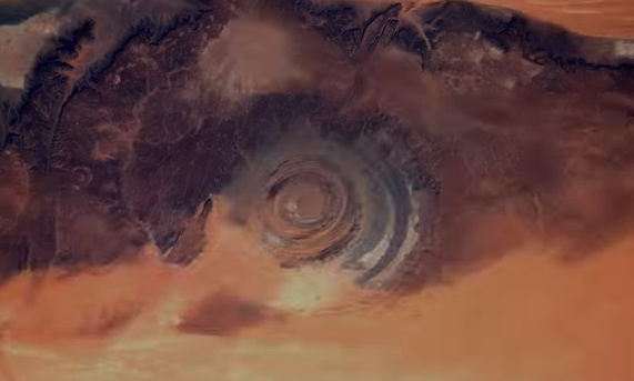 1. Глаз Сахары В западной Сахаре, в 40 километрах от поселения Уадан находится структура, которая представляет собой уникальные геологическое образование, из колец диаметром около пятидесяти километров. Это необычное явление природы носит много красивых названий: ока земли, глаз Сахары, глаз пустыни. Так что же это такое на самом деле? На первый взгляд может показаться, что своим возникновением этот удивительный странный природный объект обязан упавшему, сотни лет назад, на поверхность земли метеориту. Но в реальности все обстоит иначе, горные породы залегающие в форме купола, под воздействием внешних факторов, постепенно срезались, образуя в итоге вот такие вот кольца. Интересно, что эти самые круги являются чередующимися слоями горных пород различного происхождения, возраст которых составляет миллион лет, а еще загадочный природный объект может менять цвет в разные время суток. Наконец-то что-то мистическое скажите Вы, но к сожалению, нет. Смена цвета объясняется лишь эффектом измене