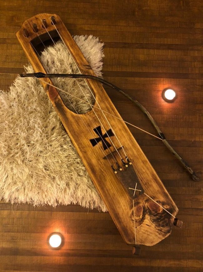 -Для смычка: Любая изогнутая деревянная палочка + конский волос (около 60 см) + канифоль;