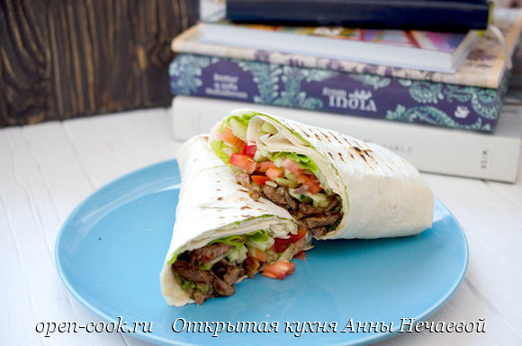 Для нас двоих запеченной утки хватает на 3 дня. И этот рецепт шавермы как раз с мясом, оставшимся после запекания утки с яблоками. Можно, конечно, специально обжарить утиное мясо для этой шавермы, но если у вас осталось готовое мясо (хоть запеченное, хоть вареное или жареное), то вы теперь знаете, что с ним можно сделать. На 1 шаверму: Мясо нарезать небольшими кусочками или разделить по волокнам. Разогреть сковороду с маслом и обжарить на нем мясо до легкой корочки. Добавить соус терияки, перемешать и влить воду. Помешивая, готовить минуты 2-3. По лавашу распределить листья салата. С верхнего края, немного отступив, выложить мясо (советую длину начинки делать чуть меньше диаметра вашей сковороды). По мясу равномерно распределить огурец и помидор, порезанные соломкой. Немного завернуть верхний край (тот, что у начинки), сложить боковые части лаваша и свернуть рулетом. О том как сворачивать шаверму подробно показано ТУТ. Разогреть сухую сковороду (или сковороду гриль), положить на нее ша