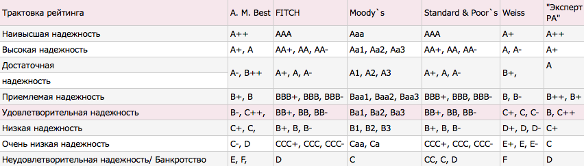 Агентства обозначают рейтинг по-разному, как правило, высший рейтинг — это AAA. D — «the default» — самый низкий, который обозначает полную неплатежеспособность. Вот расшифровка оценок основных агентств: