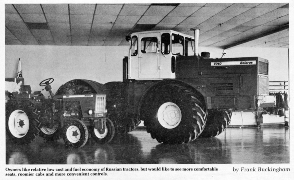 Ни для кого не секрет, что советская сельхозтехника поставлялась на Запад под брендом BELARUS. Некоторые дилеры, чтобы угодить своим клиентам, могли ставить на тракторы свои собственные кабины, как это было , например, с ДТ-75 и Т-150К. В конце 70-х журналом Farm SHOW были опрошены некоторые владельцы советской техники на Среднем Западе. Давайте посмотрим, что они рассказали в своих отчетах. Владелец из Миннесоты рассказал, что он рассматривал тракторы американского производства, но не мог договорится с продавцами в финансовом отношении. «Я уговаривал дилера снизить цену до 11500 долларов за бензиновую модель. Когда он сказал мне взять трактор или уйти, я ушел и купил Belarus 500 с дизельным двигателем и сопоставимой мощностью по цене 6000 долларов». Джо Уэст из Озарка, Миссури, который также в первую очередь выбирал из тракторов американского производства, сказал, что ему предлагали «изношенные модели 10-летней давности примерно по той же цене, что я заплатил за новый Belarus с новыми