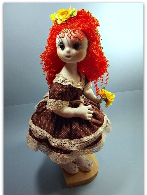 Это продолжение статьи о моих куклах, начало можно почитать ЗДЕСЬ! ...Затем на свет появилась - Александрин, этот образ мне понравился больше всех остальных кукол, настолько она была нежная и даже из далека напоминала фарфоровую статуэтку. Рост у куколки - 42 см, огненно-рыжие волосы придают ей особое очарование! Я привезла Александрин на "Антикварный салон " в Пермь и конечно же она осталась жить в Перми, ее забрали в первый же день. Платье было сшито из американского хлопка, с отделкой льняным кружевом, для чулочков я нашла тонкие детские гольфики и уже из них , на руках сшила чулочки. Волосы - это итальянская шерстяная пряжа, 600 метров на 100 гр, она тонкая, но упругая и за счет этого очень хорошо завивается и отлично держит форму. Кукла может стоять только за счет подставочки, но она практически не заметна, все внимание переходит на саму куклу. И вот еще один образ - жгучая и знойная брюнетка Кармелия! Все куклы сделаны от одной технологии, а это значит - все суставкичи поворачива