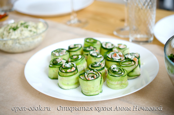 Обожаю рулеты из огурцов с разными начинками! Это красивая и легкая закуска, которая всегда пользуется популярностью на празднике. Эти рулеты я готовила на юбилей свекрови. Внутри нежный сливочный сыр, слабосоленый лосось и укроп. Вот и весь рецепт :) Количество рулетов зависит от количества огуречных ломтиков. Лучше взять гладкие длинноплодные или среднеплодные огурцы. Нарезать их вдоль тонкими ломтиками, легче всего это сделать овощечисткой. Смешать в миске сыр, мелко нарезанный лосось и измельченный укроп. Можно добавить немножко свежемолотого черного перца для пикантности. Выложить немного получившейся смеси на огуречный ломтика, распределить по нему равномерно и скатать рулет Благодаря сыру скреплять эти рулеты ничем не надо, и так все хорошо держится. Рецепт впервые опубликован на сайте open-cook.ru: 28.12.2019, набрал просмотров: 1436 и комментариев: 1