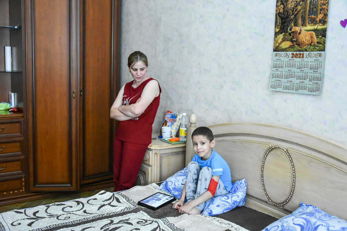 Гульнара живет в дальней комнате вместе с сыном, шестилетним Мурадом. У него уже прошла трансплантация костного мозга. Мурад средний в семье. Всего у Гульнары трое детей: еще старший мальчик и младшая девочка. За ними, пока мама с братиком на лечении, приглядывает отец и большая семья.