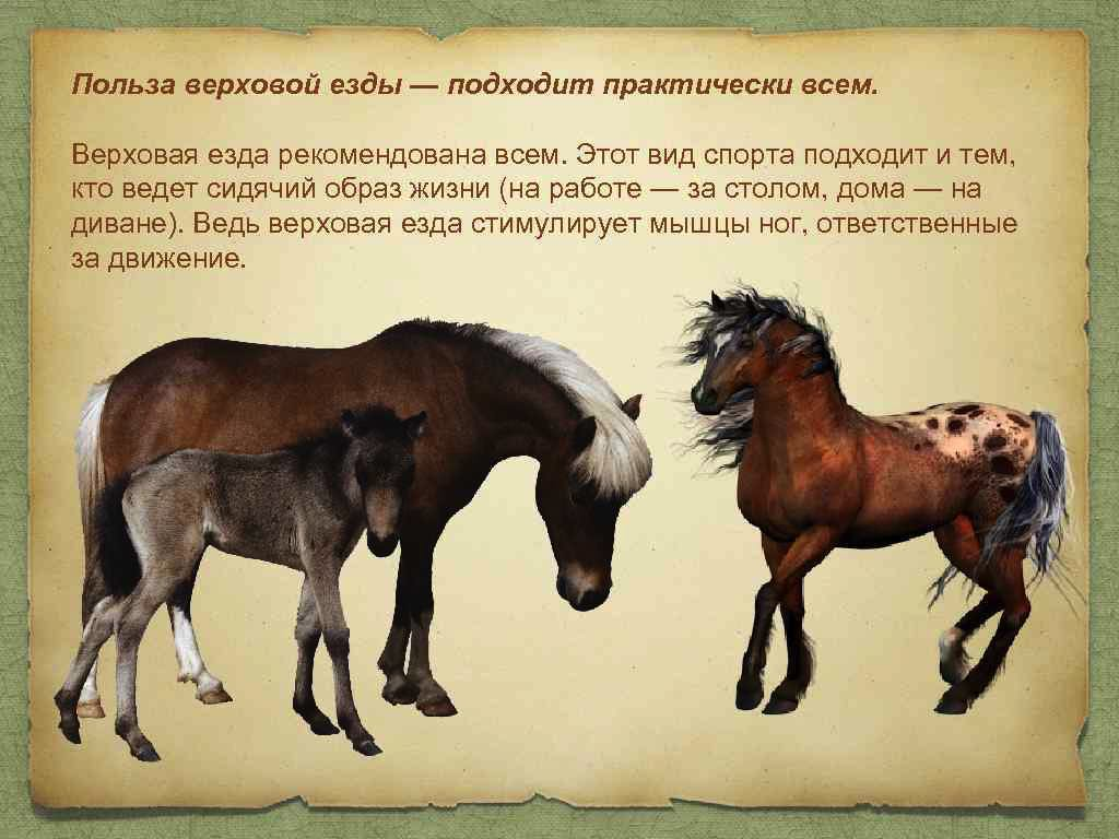 Верховая езда на лошади одинаково полезна для людей любого возраста. Конные прогулки помогают держать мышечный тонус в норме, благоприятно сказываются на скелетной мускулатуре, тренируют вестибулярный аппарат, снимают стресс и напряжение и т.д. Верховая езда благотворно влияет на дыхательную и кровеносную систему, предотвращает многие заболевания. Единственным противопоказанием к общению с лошадью служит индивидуальное проявление аллергии или обострение хронического заболевания. Верховая езда эффективно позволяет сбросить лишний вес и приобрести более утончённую фигуру. Пассивная работы большинства группы мышц во время конной прогулки способствует не только физическому укреплению, но и сжиганию калорий. Также верховая езда полезна при ряде гинекологических заболеваний – улучшается кровообращение в области малого таза, укрепляются мышцы живота. Положительный эффект от занятий верховой ездой на организм неоценим. Регулярные занятия предотвращают риск возникновения психических расстройст