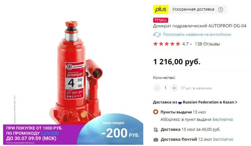 1. Домкрат гидравлический AUTOPROFI DG-04 Автолюбители, если у вас ещё нет домкрата, то вот вам гидравлический AUTOPROFI DG-04. Рабочая высота до 350 мм, максимальный груз 4 тонны, встроенная защита от перегруза, а отзывы только положительные. Максимальный груз - 4 тонны. Встроенная защита от перегруза.