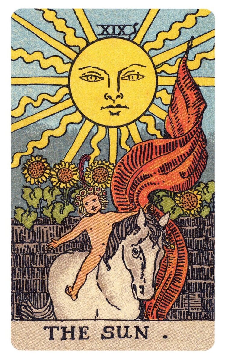 На карте изображено большое солнце с лицом. Так же видим еще символы солнца – четыре подсолнуха. На заднем фоне – стена. На ближнем фоне – мальчик, восседающий на коне. Голову его венчает венок из цветов и пера, в левой руке он держит алый флаг. Это очень положительная карта в раскладе Таро. Она означает радость и счастье, а также успех, позитивные достижения и хорошее здоровье. Ваши отношения благословятся разделенным счастьем и процветанием, а ваши усилия принесут плоды.
