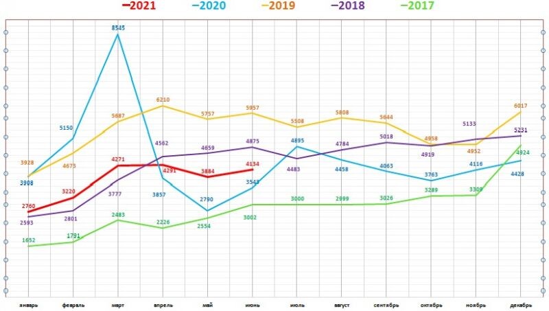 Согласно свежим данным Белорусской автомобильной ассоциации (БАА), в первом полугодии 2021-го спрос на новые легковые автомобили в стране вырос на 20,79% по сравнению с аналогичным периодом 2020-го. С начала года члены БАА продали 12 309 экз. За прошлый месяц белорусским дилерам удалось реализовать 4 134 машины, что выглядит более оптимистично при сопоставлении с майским результатом (3 884 ед.).