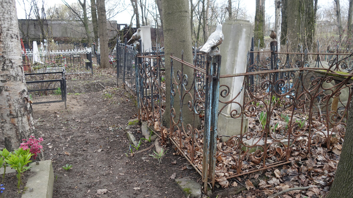 По следам апрельской прогулки по Волковскому кладбищу в Петербурге (Холерный участок - первый пост о посещении этого места). Конечно же, на Холерном участке Волковского кладбища много могил, вырытых и оформленных в последние несколько десятков лет. Хотя встречаются и очень старые надгробия, датированные серединой 19 века, например, вот это: Одна могильная оградка меня очень заинтересовала: признаюсь, не видела такого ранее. На ней были посажены очень искусно выполненных фигурки птиц. Из Сети удалось узнать, что птица (в данном случае - голубка) на могильном памятнике может символизировать Святой Дух. Обратите внимание, как точно и внимательно скульптор отнесся к деталям. Голубка как живая, кажется, что вот-вот вспорхнет. И даже образовавшаяся ржавчина на ней (а создалось ощущение, что за могилой долго не ухаживали) не портит впечатления от скульптуры. И таких голубок - четыре, в каждом уголке ограды. Печально и очень красиво.