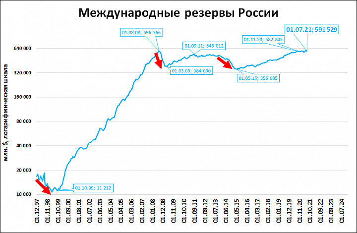 ЗВР в 1999-2008 годах бурно росли. Затем рост прекратился и сейчас они на уровне августа 2008 года. Покупки валюты в ЗВР оказывали (и продолжают оказывать) благотворное влияние на экономику. Валютные интервенции (расходование ЗВР на поддержание курса рубля) были губительными для экономики (и остаются таковыми сейчас). Механизм понятен: когда ЦБ эмитирует рубли и покупает на них валюту, денег в экономике становится больше и экономика расцветает. Когда ЦБ продаёт валюту (выкупает у экономических субъектов рубли), рублей в экономике становится меньше, и экономика впадает в кризис (см. красные стрелки на графике). Важно ещё, чтобы эмитированные Центробанком рубли не обесценивались, это отдельная тема. Рублёвая денежная масса должна расти не номинально (как при Гайдаре, например), а реально, после поправки на инфляцию. Но и здесь покупка ЗВР - хороший вариант. Ведь если рубли эмитируются при покупке доллара, то они становятся "обеспеченными" этими долларами, что в глазах обывателей (да и не