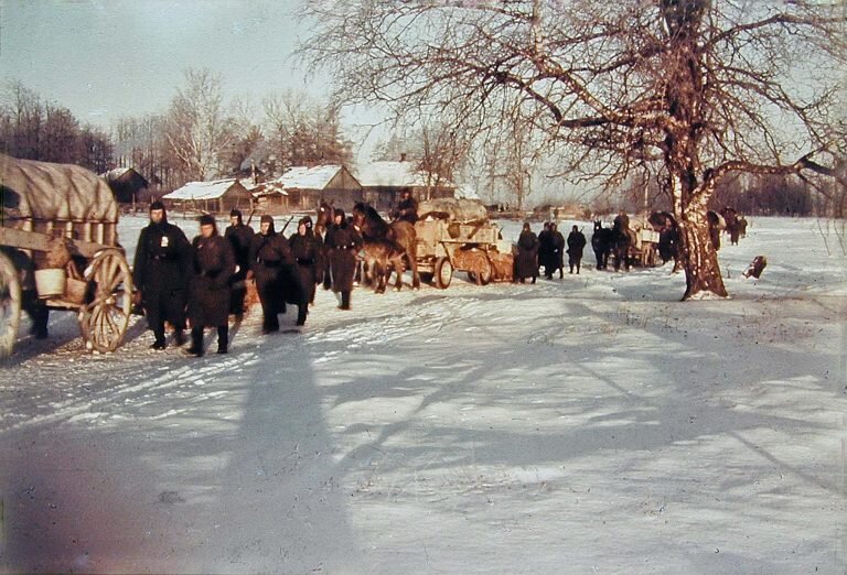 Colored photo of the Second World War: A cart-train of German Army (Wehrmacht) is moving through the Soviet village. In the center of the frame, the standard Wehrmacht cart – Heeresfeldwagen 7/11. Kaluga region.