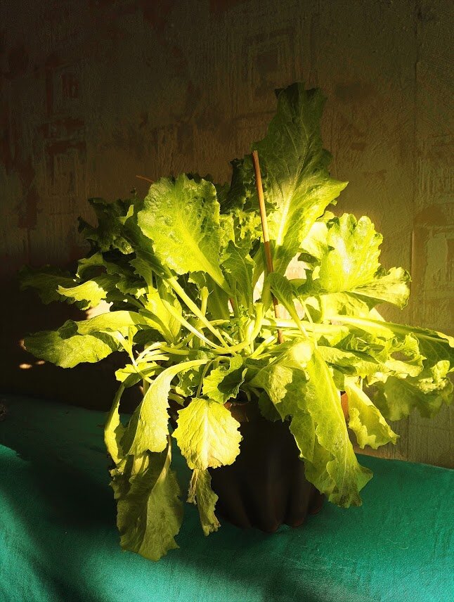 Люблю экспериментировать с разными растениями. Именно - выращиваю их в квартирных условиях в отсутствии солнечного света. В коридоре установлен стеллаж с фитолампами. Именно салат оказался той культурой, которую хочется выращивать в любое время года. Как летом, так и зимой. Летом, да, салат куда более доступен на прилавках и в ларьках города по ценовой политике, но в экологичности такого продукта у любого человека бывают сомнения. Так, прикупив пару пакетиков семян, я с легкостью получила вот такое чудо. Из второго пакетика - такое: Таких двух кашпо нам хватило с мужем, чтобы полакомиться за несколькими ужинами и очень вкусно своей зеленушкой. Отмечу, что из-за переосвещения, так как не всегда выключала лампы на ночь, салат чуть горчил. Но есть решение вопроса: опустить срезанные листья в холодную воду на 5 минут. Горечь уходит. Хватило даже на заготовку: Убрала в холодильник до следующего раза. Хранился примерно около 5 дней и не зачах. Единственный момент, для того, чтобы ре