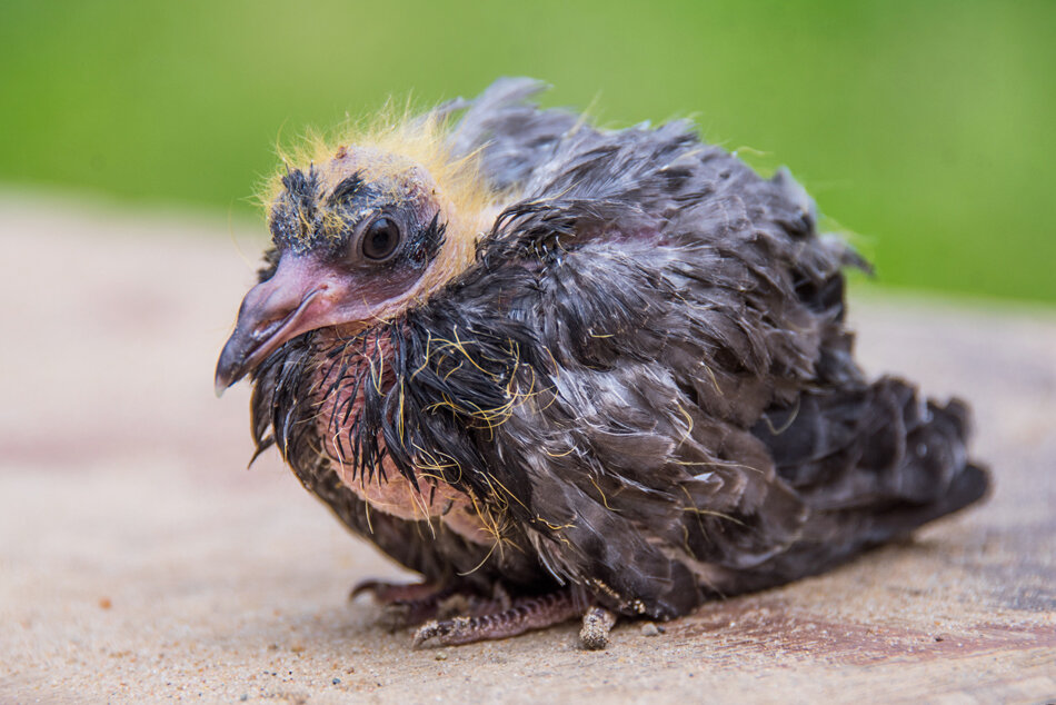 Голуби надежно защищают своих птенцов от чужих глаз. Большинство людей даже не знают, как они выглядят. Однако могут возникать ситуации, при которых птенчик оказывается оторванным от родительского гнезда.