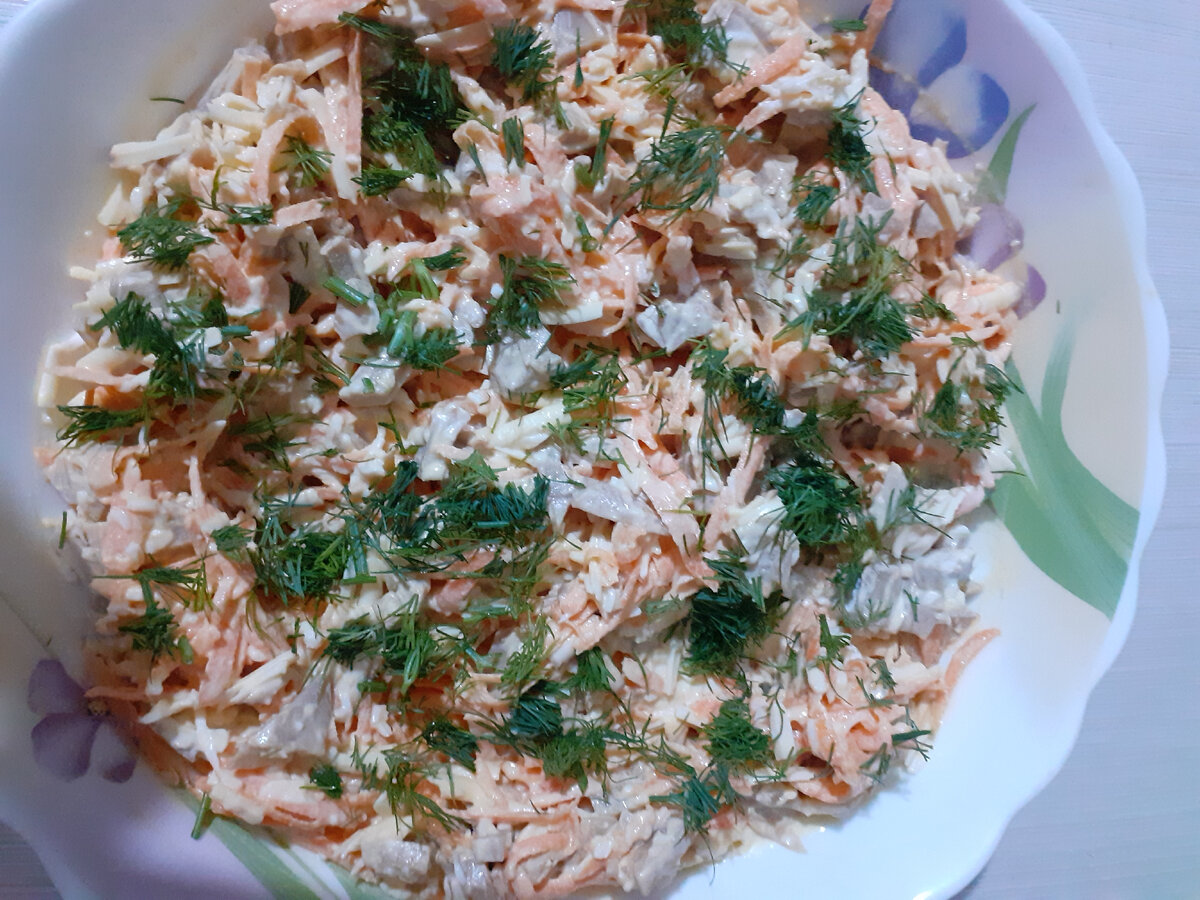Всем привет! Сейчас расскажу про вкусный и быстрый салат. Из "заморочек" нужно сварить только яйца, а остальные продукты натираем и нарезаем. В остовном в салат все ингредиенты натираем на терке, поэтому у салата такое название "тертый". Блюдо сытное, нежное и обладает приятным копченым вкусом. Не буду томить, делюсь рецептом! Способ приготовления: Я использую для этого салата копченый колбасный сыр, можно использовать, конечно и простой колбасный сыр, но копченый вкус придает блюду свою особенную "изюминку". Сыр натираем на крупной терке, перекладываем в салатник Морковь моем, чистим и натираем также на крупной терке Добавляем морковь к сыру Следующие на очереди консервированные шампиньоны. Откидываем грибы на дуршлаг, ждем когда стечет маринад. У меня шампиньоны были резанные, но нарезка крупная , поэтому я порезала их чуть меньшими кусочками. Добавляем грибы в салатник к остальным продуктам Вареные яйца натираем на мелкой терке , добавляем в салатник Чеснок чистим от шелухи и нат