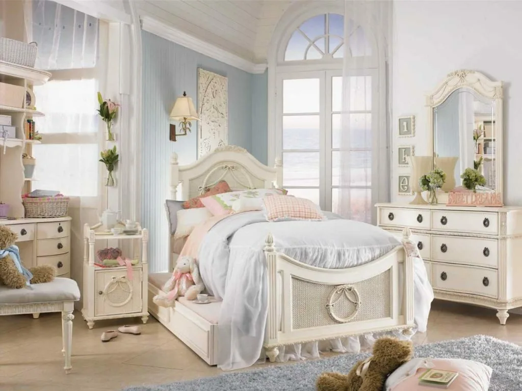 Продолжаем наши уроки по стилю французский шик. Сегодня поговорим о детских спальнях. В детских также как и во взрослых спальнях, стены могут быть окрашены, но можно использовать обои. Оттенки берём светлые, пастельные - бежевый, молочный, сероватый, розовый и так далее. Используется классическая изящная мебель на изогнутых резных ножках. Главное - избегать эффекта старины, иначе это может увести нас в винтаж. Также как и во взрослых спальнях, в детских часто можно встретить зеркала в богатых резных рамах. Люстры чаще всего классические, с канделябрами или плафонами. Детскую от взрослой спальни отличает наличие детского декора, это могут быть картинки или постеры в классических рамках. Также можно использовать текстиль, не просто дамаск или что-то весёленькое, полосочка, например, или тот же горошек. Для мальчиков этот стиль не очень подходит, только если для новорождённых.