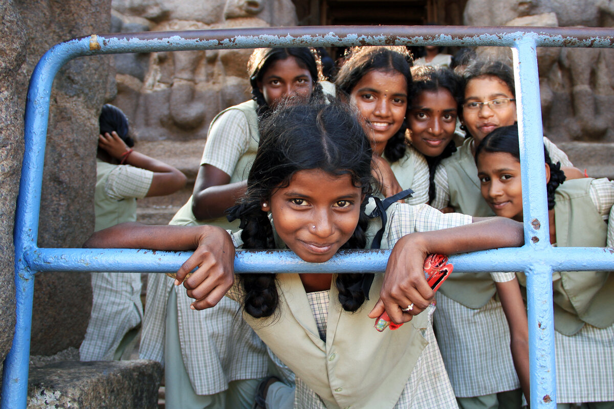 Индийские школьницы на экскурсии в Шор Темпл в Махабалипураме.