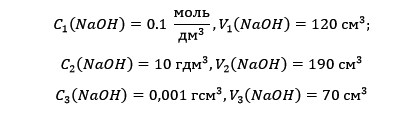 Вычислить молярность раствора NaOH, полученного сливанием указанных объемов трех растворов гидроксида натрия, разной концентрации: Рассчитать навеску Na2C2O4, которую необходимо добавить к смеси растворов С1 = 0,5 М, V1 = 600 см^3 и С2 = 0,2 М, V2 = 800 см^3 указанных концентраций, для получения 2 дм^3 точно одномолярного раствора. В воде растворили 0,5 г технического сульфита натрия и прибавили 30,00 см3 раствора йода концентрацией 0,1 моль/куб.дм. На титрование избытка йода пошло 16,00 см3 раствора тиосульфата натрия, в 100 см3 которого содержалось 1,2410 г х. ч.. Определить процентное содержание сульфита натрия в образце технического продукта. т. е. моль тиосульфата натрия эквивалентна половине моль йода и половина моль сульфита натрия. На основании закона эквивалентов можем написать: