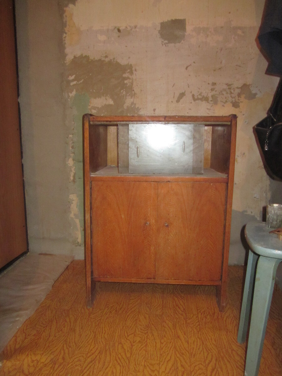 Нафриганили мы с мужем симпатичную шпонированную тумбу. Старушка оказалась крепкой и в довольно хорошей сохранности. Только изрядно заляпана жиром и, почему-то, вареньем. Видимо, стояла у кого-то на кухне. А мы решили определить ее в прихожую. Первым делом дама была отмыта от грязи и, частично, от лака. О том, как это сделать быстро, я рассказывала раньше. Стеклянные дверки с верхней полки мы убрали - открытая ниша удобнее для того, чтобы быстро положить/взять перчатки, ключи и прочие мелочи, которые обычно гнездятся в прихожей. Впрочем, при желании, поставить их назад недолго - и дверки, и полозья сохранили на всякий случай. А к деревянным дверям прикрутили временную ручку для удобства работы с ними. Начала я барышню шкурить, и оказалось, что ее деревянные ножки по низу полностью пришли в негодность. Шпон там держался исключительно на слоях грязи, видимо. Восстановлению расслоившаяся фанера не подлежала. Было решено поставить тумбу на более надежные ноги. Занимался этим полностью с
