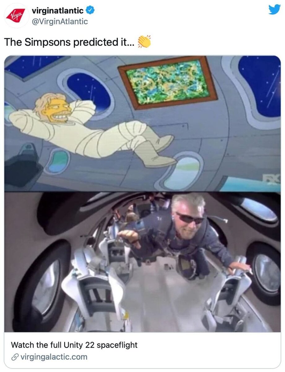 Компания Virgin сообщила в социальных сетях о том, что мультсериал «Симпсоны» уже предсказал полет основателя компании Ричарда Брэнсонав космос. Об это пишет Virgin Atlantic в Twitter.Сцена, в которой Брэнон летал в невесомости в своем космическом корабле появилась в 8-ом эпизоде 20 сезона «The Burns and the Bees», вышедшем в декабре 2008 года.