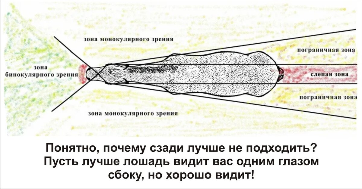 Везде пишут и все говорят - не подходи к лошади сзади! Так говорят даже те, кто вообще с лошадьми никак не знаком, только знает, что сзади подходить нельзя. Откуда такие познания о животном, с которым вообще никогда дела не имел? А к крокодилу нельзя спереди подходить? А к корове сбоку? А почему? На самом деле все просто. У каждого мало-мальски крупного животного есть "опасные зоны" и "безопасные зоны", расположение которых зависит от строения тела животного, его повадок, скорости реакции и его положения в пищевой цепочке по определению "хищник" или "жертва". Лошадь в природе "жертва". Поэтому, у нее первая реакция при опасности - бежать. Если пугающий предмет в зоне досягаемости, она попытается ударить его передними или задними ногами, а потом кинется бежать. Спереди и сзади у лошади есть "слепые зоны" - места, где она вообще не видит. Это строго перед мордой и прямо за хвостом, не более метра. Именно там находиться очень опасно. Даже если эта лошадь своя, знакомая, спокойная, ласко