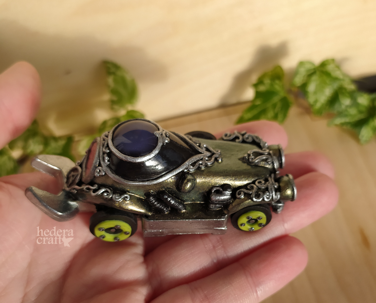 Обычно я делаю украшения, но однажды захотела сделать особенный подарок для сына подруги. Он как и многие мальчики обожает машинки. Вот что из этого получилось. Купила простенькую машинку с металлической деталью. Собственно ради этой детали я ее и брала. Она придаст прочности всей конструкции. Ведь игрушкой будет играть ребенок. Убрала весь пластик. Поскольку я леплю из запекаемой полимерной глины, обычный пластик может поплавится и все испортить. Набрала объем с помощью маленькой деревяшки и фольги: Облепила полимерной глиной: Покрасила и залакировала. Итог: фары с люминофором светятся в темноте (спереди зеленым, задняя большая красным). Корпус хамелеонит бронзово-зеленым металликом. Камень на крыше меняет цвет в зависимости от температуры. Хотела сделать фэнтезийную тачку с максимом волшебства. Мальчик был очень доволен^^