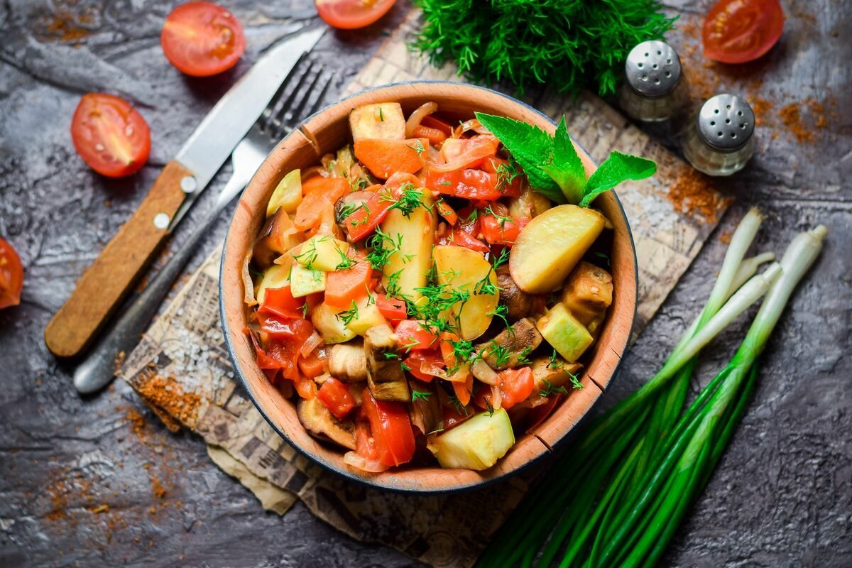 Добавьте картофель и морковь. Жарьте, помешивая, на среднем огне в течение 10 мин. Добавьте сладкий перец и помидоры. Перемешайте и готовьте еще около 5 мин.