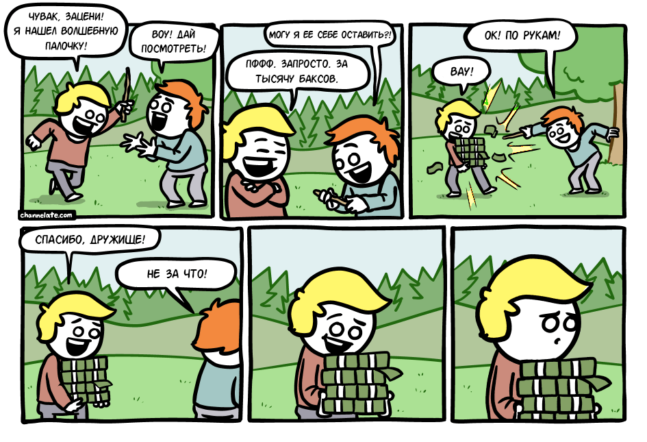 Гротескная пародия на реальность или жиза-жизненная, каждый видит в смешных нарисованных историях, которые принято называть комиксами, что-то свое. А комиксы про деньги и вовсе воспринимаются неоднозначно. Казалось бы деньги и финансовые вопросы это серьезная тема, какой уж тут юмор и комиксы. Ан нет, наши художники умеют обыграть любую тему и нарисовать смешной комикс обо всем на свете, даже о деньгах. Мне стало интересно сравнить подход разных комиксистов к денежному вопросу и посмотреть, какие комиксы о деньгах нарисовали некоторые художники. В подборке есть и российские и иностранные художники, и у каждого свой взгляд на денежный вопрос. Создатель серии смешных веб-комиксов Channelate нарисовал смешной комикс о человеческой глупости и деньгах. Автор живет в Солт-Лейк-Сити и рисует замечательные комиксы, которые понравятся всем любителям черного юмора. Такой уж у автора стиль, показывать слабости и недостатки через смешные картинки. Смешной веб-комикс о жадности выпустила британск
