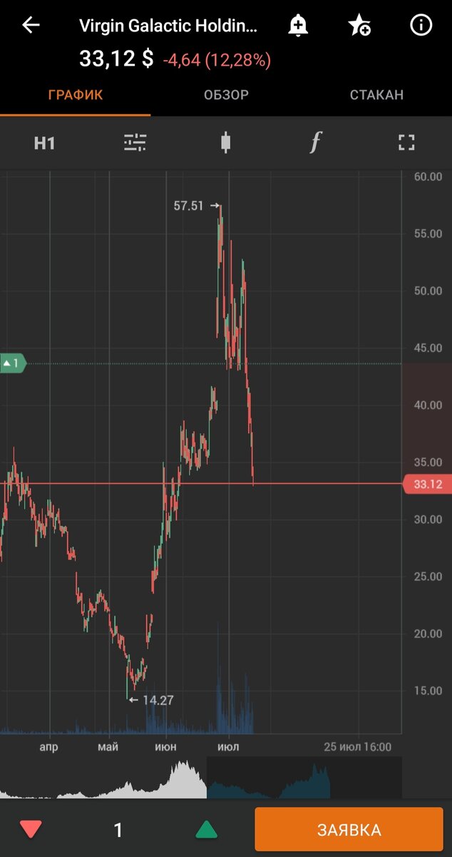 Пару дней назад произошло событие: я впервые купила буржуйские акции! И… Стоимость акции снизилась ещё на 10$ Купила я аж 3 акции, соотвественно потеряла больше 30$ Расстроилась? Нет. И вот почему: 1. Покупала на хайпе и снижении (все же слышали про волатильность? так вот это как раз она самая😀) 2. Акции не слишком дорогие 3. Всего 3 штуки (это очень мало) 4. Я не собираюсь спекулировать (ни разу не трейдер я), подожду пока поднимутся 5. Не формирую инвестпортфель (а пора бы) Теперь конкретно: Не знаю чё там в ящике, а в интернетах все уши прожужжали про полёт Брэнсона на его туристическом космическом… Чисто из любопытства в полглаза следила за котировками Virgin Galactic. Понятно было, что в цену уже был заложен положительный исход испытаний и полёта, да ещё Маск билетик забронировал… И интересно было насколько вырастет акция и как упадёт в течение недели, ведь инвесторы будут выходить и фиксировать прибыль. Даже моего экономического недообразования достаточно, чтобы всё э