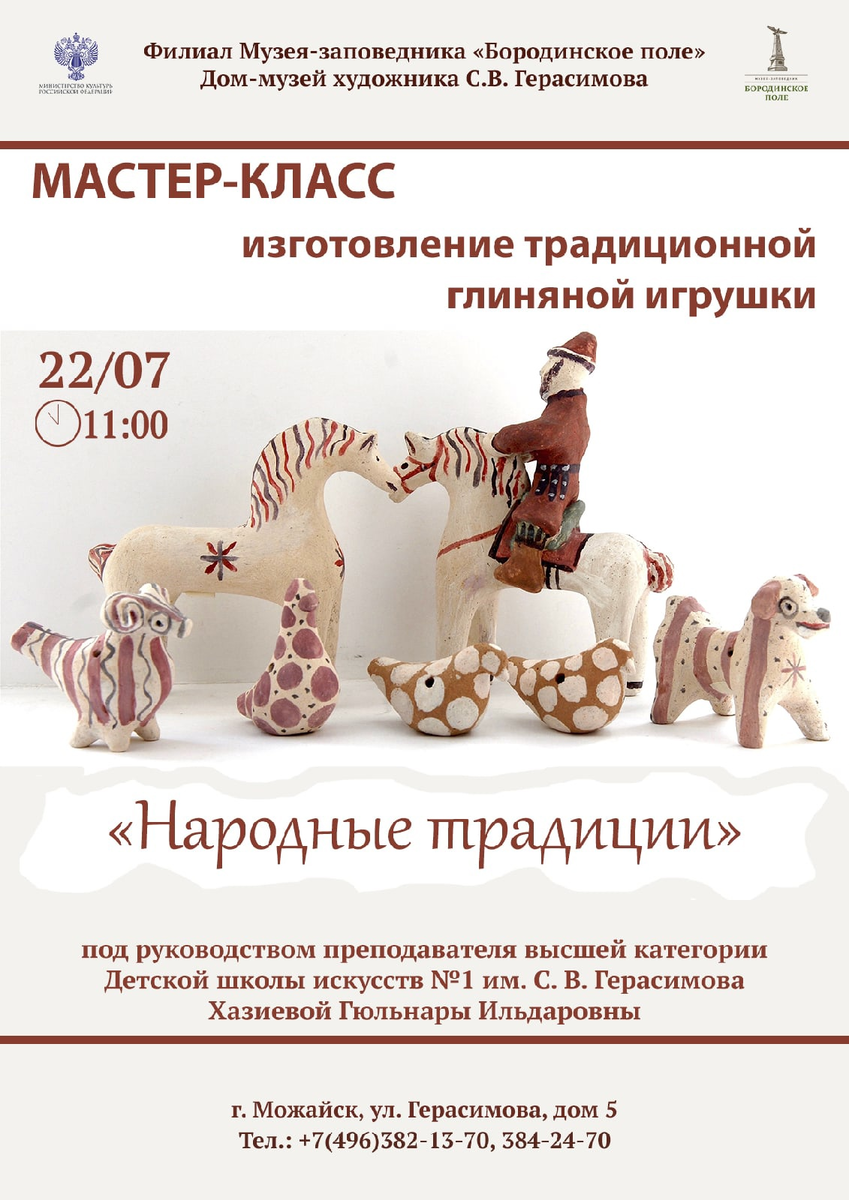 22 июля в филиале Музея-заповедника "Бородинское поле", Доме-музее художника С.В. Герасимова состоится мастер-класс по изготовлению традиционной глиняной игрушки.