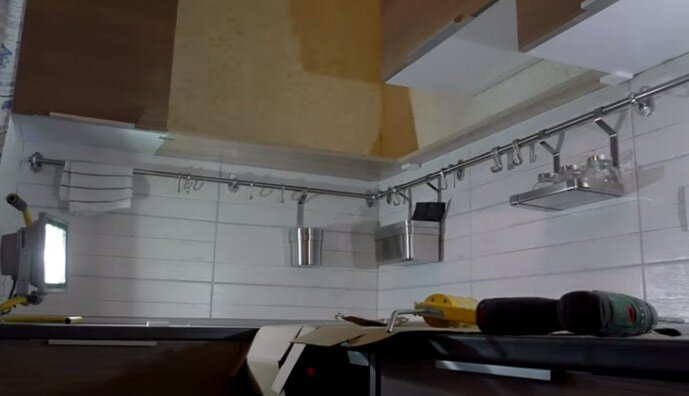 Чаще всего их монтируют над столешницей, под шкафами. Такое решение позволяет организовать место для наиболее часто используемых предметов.