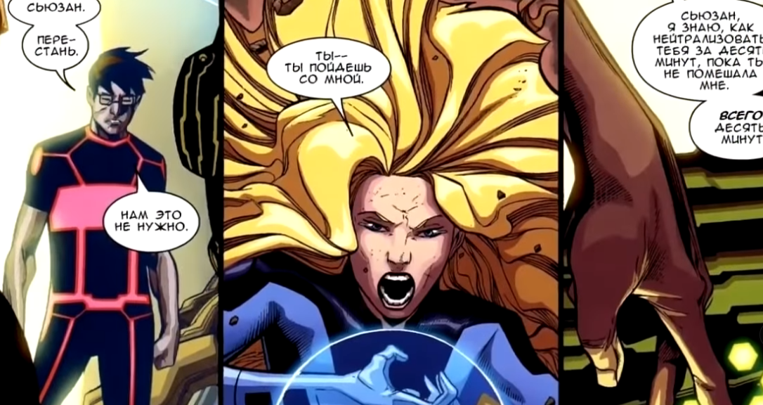 Предыдущая часть Дисклеймер: в данной статье раскрывается сюжет комиксов Ultimate Fantastic Four. Соответственно, здесь буду спойлеры. Много спойлеров! Так что, если не читали комикс, но планируете, советую пока отложить данный материал. Если с этим все оке, то приятного вам времяпровождения. Сью полагала, что знала своего возлюбленного, но теперь, смотря на того, кем стал Рид Ричардс, девушка осознала, как сильно заблуждалась. Она даже не догадывалась, что после разрыва отношений Рид всецело окунулся в исследования. Он сказал, что, если бы они до сих пор встречались, мужчина не смог бы совершить так много открытий. Сью хотела арестовать Ричардса. Она понимала, что ее бывший возлюбленный очень опасен, но эти девушка лишь спровоцировала его. Он не хотел причинять красавице боль, но она, раз за разом атакуя агрессора, вынудила Рида пойти на крайние меры. Наблюдая за тем, как сражаются Рид Ричардс и Сью Шторм, Рик Джонс понял, зачем его прислали в это время. Он внезапно по