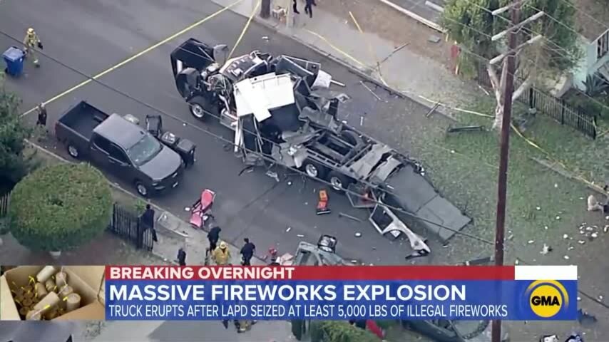 Los Angeles Times - 03 July -17 человек пострадали от взрыва во время конфискации фейерверков в Лос-Анджелесе. Полицейские проводили контролируемое уничтожение нелегальной пиротехники, но произошел сбой, и взрыв оказался сильнее, чем планировалось. На представленном видео видно, как происходит взрыв и грузовик накрывает дымом, а затем слышны звуки сработавшей сигнализации стоящих рядом машин. По данным СМИ, взорвался грузовик, специально предназначенный для контролируемой детонации пиротехники, но он по какой-то причине не выдержал взрыва двух тонн фейерверков из конфискуемой партии. Сообщается, что все эти фейерверки незаконно хранили в жилом доме. Основная часть пострадавших — сотрудники полиции. Известно также, что пострадало шестеро гражданских лиц, трое госпитализированы с тяжелыми травмами. Ущерб нанесен также домам и машинам рядом с местом взрыва. Следователи выясняют обстоятельства произошедшего. ABC7: Взрыв на юге Лос-Анджелеса: 17 раненых в результате взрыва конфиско