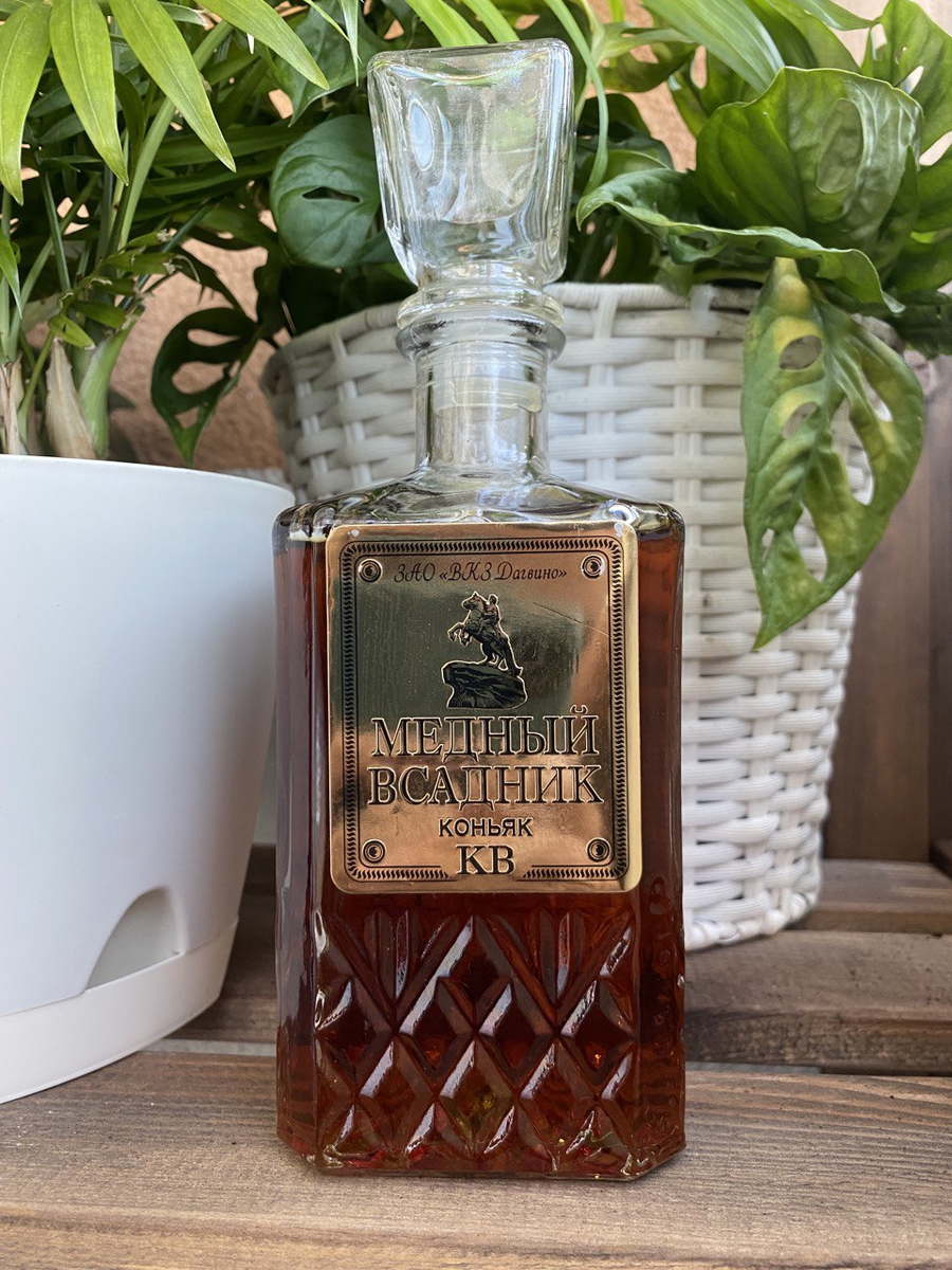 Приветствую, камрады! Многих из вас заинтересовала корейская водка "соджу", которая считается самой продаваемой в мире. Решил её поискать у себя в городе для обзора, стоит ли она внимания или нет. Но мои поиски соджу были прерваны вот таким прекрасным образцом коньяка. Ранее я такого коньяка не встречал, да и всё что у нас продаётся до 1000 рублей - коньяком то не назвать, не праздничный. Его только если на поминки брать, согреться на рыбалке или с целью вырубиться пораньше спать после тяжелого трудового дня. Знакомьтесь, коньяк выдержанный "Медный Всадник КВ". Понравился тем, что разлит в красивом штофе, давно не встречал коньяк в таком графине, в СССР такая посуда была популярной. Как я позже узнал - это сувенирная версия. Медный всадник КВ разливается в обычные бутылки. Производитель - винно-коньячный завод "Дагвино". Один из старейших российских заводов, основан в Ленинграде в 1936 году. Сейчас купажирует и выдерживает французские, армянские и дагестанские коньячные спирты. В