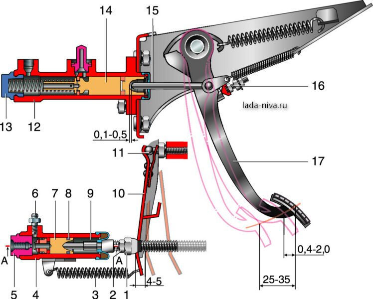 Педаль, главный и рабочий цилиндры привода выключения сцепления