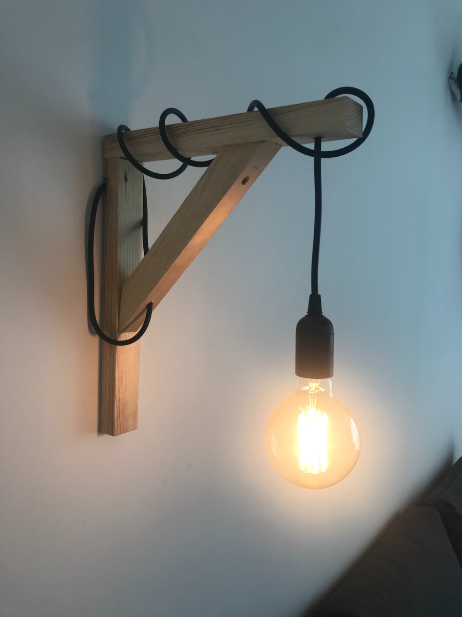 Много вариантов было рассмотрено, однако, решили сделать дёшево, красиво. Изначально это была просто доска за 100 рублей, провод за 200, патрон за 45, и лампочка💡 Сделать его очень просто, вырезаем обычный уголок, скрепляем тем что есть, мы крепили винтами для мебели. Расскажу о нюансах. Сразу скажу, никаких скруток проводов - это опасно, покупаете специальные клеммы для соединения проводов, желательно, чтобы можно было соединять как одножильные так и многожильные провода. Сзади маленькой киянкой вырезаем углубления для проводов переходников и прочее, чтобы все некрасивое осталось. Подвешиваем на обычный крепёж для полок. Покупаем красивую лампу, моя за 300 руб. Ну и котика вам