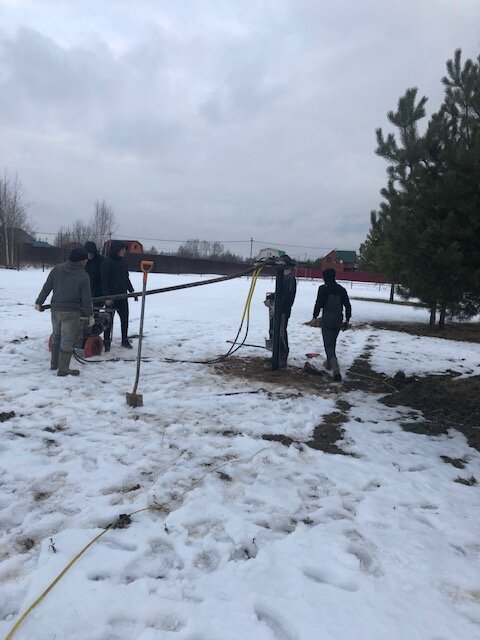 Через 3 недели после подписания договора, приехали устанавливать свайный фундамент. Тут сразу скажу, что на фундаменте не нужно экономить, даже если выбирать данный вид фундамента, я бы всё таки сделал обвязку по периметру для большей жёсткости. Спустя год эксплуатации чувствуются покачивания пола при ходьбе и особенно при отжиме стиральной машинки. Также сейчас я бы отсыпал периметр под домом песком для отвода воды, но что сделано то сделано!
