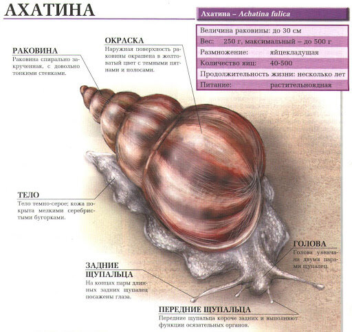 Ахатины — род сухопутных брюхоногих моллюсков из семейства ахатинид отряда стебельчатоглазых. Широко распространён в странах с тропическим климатом, высокоинвазивный вид, является вредителем сельскохозяйственных растений, особенно сахарного тростника. Находится в списке из 100 наиболее инвазивных видов. Продолжительность жизни Ахатины живут до 10 лет. Всё время жизни они растут, однако после первых 2-х лет жизни скорость роста замедляется. Ахатины могут вырасти до 25 см. Улитки неприхотливы в уходе: для их содержания достаточно террариума, грунта и элементов декора. Чем кормить Кормите их свежими овощами: брокколи, огурцы, морковь, свекла, кабачки, болгарский перец, пекинская капуста, помидоры, тыква. Белокочанную капусту предварительно обдайте кипятком. Не забудьте про фрукты – отлично подойдут яблоки и груши, арбуз и дыня, слива и персики. и кальций : гаммарус, яичная скорлупа и каракатица. Какой террариум лучшие Для содержания улиток в закрытом помещении, вам понадобится ящик и