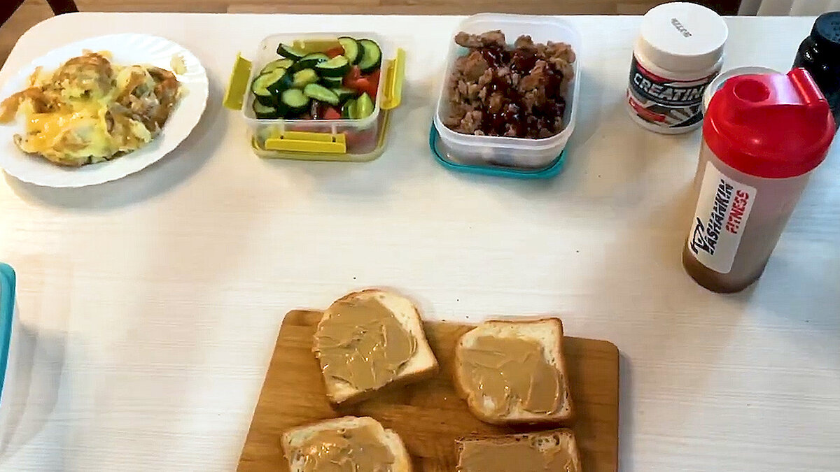Сегодня мы с Вами приготовим рацион для набора мышечной массы. Для этого, нам нужно создать предпосылки для ее набора, и это тренировки. Когда мы постоянно повышаем рабочие веса, мы создаем необходимость организму адаптироваться к нагрузке и наша задача сегодня будет его подпитать, чтобы начать строить мышечную массу. Первое, с чего мы начнём, основа основ, завтрак чемпиона - яичница. Неизменный мой завтрак на протяжении, не знаю какого уже количества времени, яичный белок остается эталоном и в гликемическом индексе он занимает первое место, как самый необходимый, самый ценный белок для организма. Поэтому с него там начнем. Яичница жарится, мы успеваем нарезать для нее сыр и будем делать тосты с арахисовой пастой. Если у вас нет тостера, это не проблема, можно воспользоваться обычной духовкой. Нарезаем сыр, а когда яичница уже под запеклась кладём на неё и подождём еще минуту, чтобы он расплавился и было повкуснее. Пока тосты еще поджариваются, мы не теряя время переходим дальше.