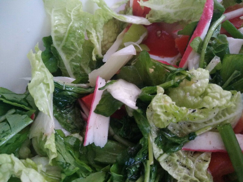Очень вкусный! Летний Крабовый салат из помидоров, яиц, салатных листьев и зелени