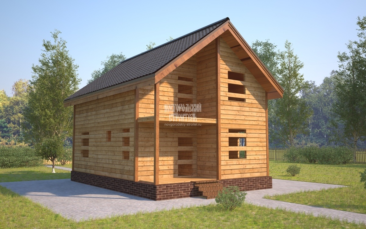 Наличие нескольких спален и как минимум двух санузлов - обязательные требования к дому для большой семьи. При этом капитальное строительство такого дома позволить себе могут не все. Для семей с относительно небольшим доходом может стать хорошим вариантов выбор проекта здания "под усадку" - при этом примерно половина стоимости жилья выплачивается сразу, а на вторую половину (стоимость отделки, коммуникаций, обстановки) можно накопить за время естественной усадки постройки. Достаточно большое "пятно застройки" обеспечивает изрядное количество полезной площади дома, при этом размеры помещений удвоены благодаря устройству высокой мансарды. Планировка дома ориентирована именно на семейное жилье: основные помещения для отдыха расположены в мансарде, на первом этаже находится только одна спальня (для пожилого человека, например). Объединенное помещение кухни и гостиной позволяет принимать большое количество гостей или собираться всей семьей. При необходимости здесь может быть также установле