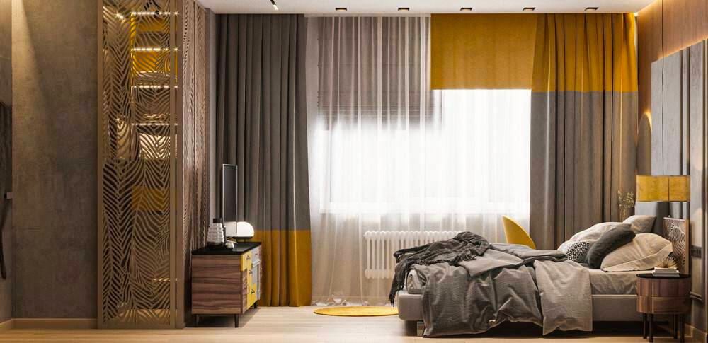 Спальня «Кот в лучах» – забавный и изящный современный проект спальни для молодой семейной пары. Его автор, дизайнер Тамара Воронцова, использовала для создания образа этой спальни, совмещённой с гардеробной комнатой – мечтой хозяйки дома – цвета 2021 года по версии Pantone. Ими стали два оттенка – Illuminating (Освещающий), яркий, тёплый и согревающий жёлтый цвет, и Ultimate Gray (Безупречный Серый) – оттенок, призванный олицетворять крепкую и надёжную основу в непредсказуемым окружающем мире. Это сочетание выглядит в этом проекте очень гармоничным ещё и потому, что символизм цветов-символов нынешнего года олицетворяет и хозяев – мужа и жену, пригласивших в свой загородный дом дизайнера для проведения переделки в рамках проекта «Фазенда Лайф». Ирина и Павел приняли решение перебраться жить за город, в дом, который раньше был семейной дачей. Дизайнерский проект стал частью капитального ремонта и переделки дома для постоянного жилья. Спальня досталась в распоряжение дизайнеров практичес