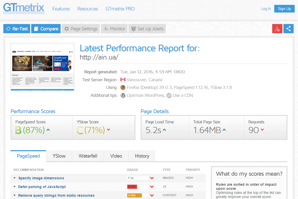 Обратите внимание на ряд показателей. В блоке Performance Scores (“Результаты производительности”) выводятся данные по оценке сайта на основе PageSpeed Insights (94%) и YSlow (68%). Они могут серьезно отличаться за счет разницы в алгоритмах, но больше внимания нужно обращать именно на значение первого показателя.